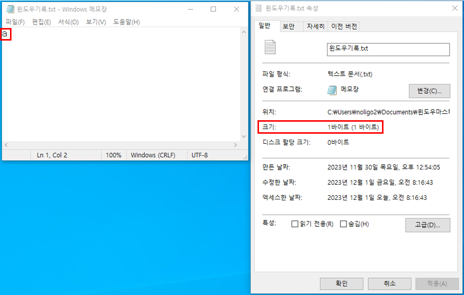 메모장에 a라는 글자를 하나 넣고 해당 파일에 마우스 우클릭 후 팝업에서 속성을 선택하면 이미지 오른쪽 처럼 팝업이 열리는데요.