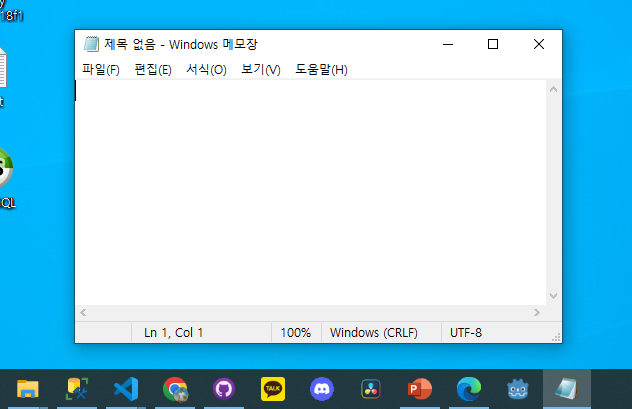 메모장을 실행하였는데요. 작업 표시줄에 보시면 메모장이 추가되어 있있는걸 확인 하실수 있습니다.