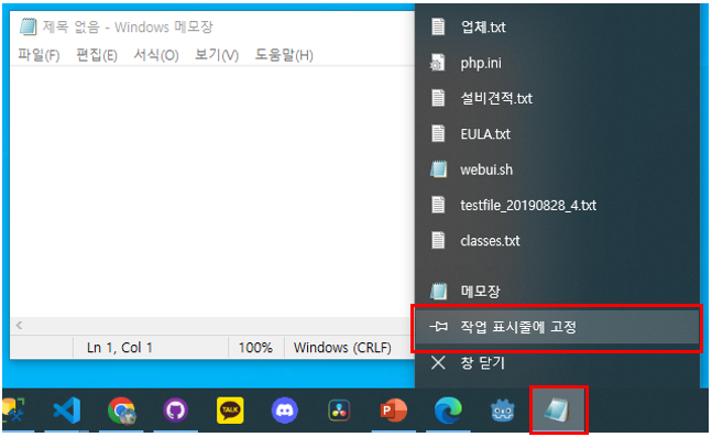 이 상태에서 착접 표시줄에 표시된 메모장 아이콘에 마우스 우클릭 후 팝업에서 작업 표시줄에 고정을 클릭하세요.