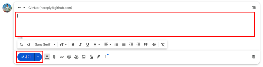중앙부분에 메일 내용을 입력하시고 보내기 버튼을 클릭하면 해당 메일에 답장을 보내게 됩니다.