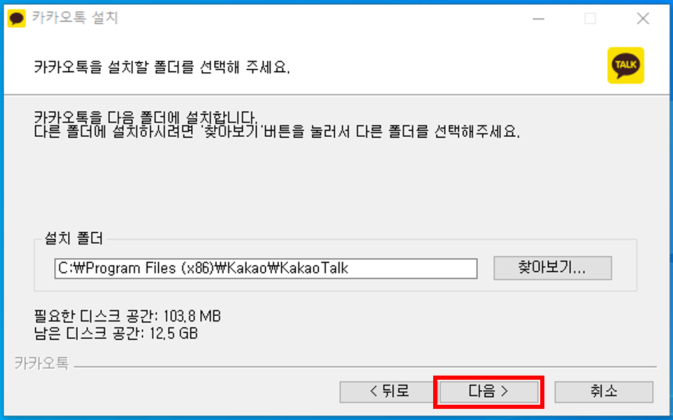 카카오톡 프로그램을 어디에 설치를 할 것인지 위치를 설정하는 부분인데요.