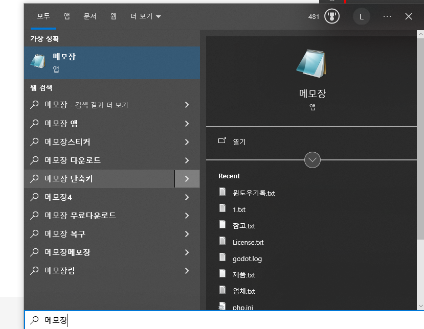 상단에 '가장 정확'이란 표현 바로 아래에 메모장이 검색되는 걸 아실수 있습니다.