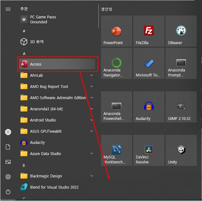시작 메뉴에 오른쪽 부분인데요. 이름이 생산성으로 되어 있는데요.