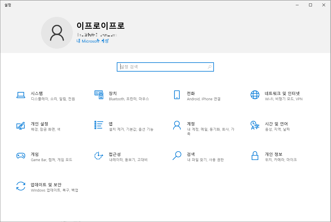 윈도우에서 사용되는 언어라던가 계정 설정, 윈도우 업데이트 등등 윈도우에서 제공하는 많은 설정기능을 사용 할 수 있는 화면입니다.