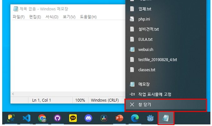 이후 작업 표시줄에 메모장 아이콘이 추가되는데요.