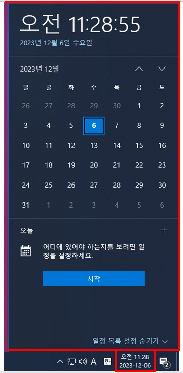 시간 및 날자 영역을 마우스 왼쪽 클릭을 하시면 위 이미지와 같이 팝업이 열립니다.