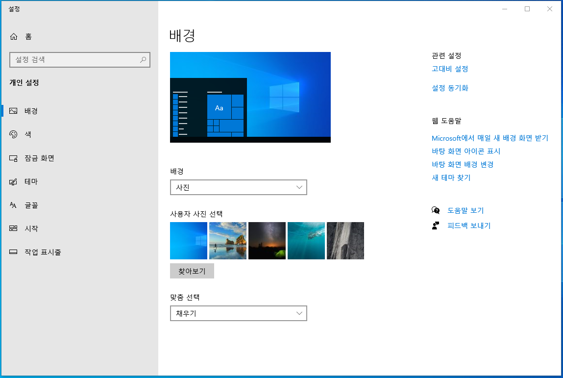 바탕화면에는 파란색 느낌에 창분 그림이 대부분이실건데요. 배경 이미지를 어떻게 표현할지를 설정하는 화면입니다.