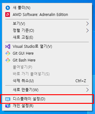 바탕화면 여백에 마우스 우클릭 후 팝업중에 보시면 디스플레이 설정이라는 항목이 있습니다.