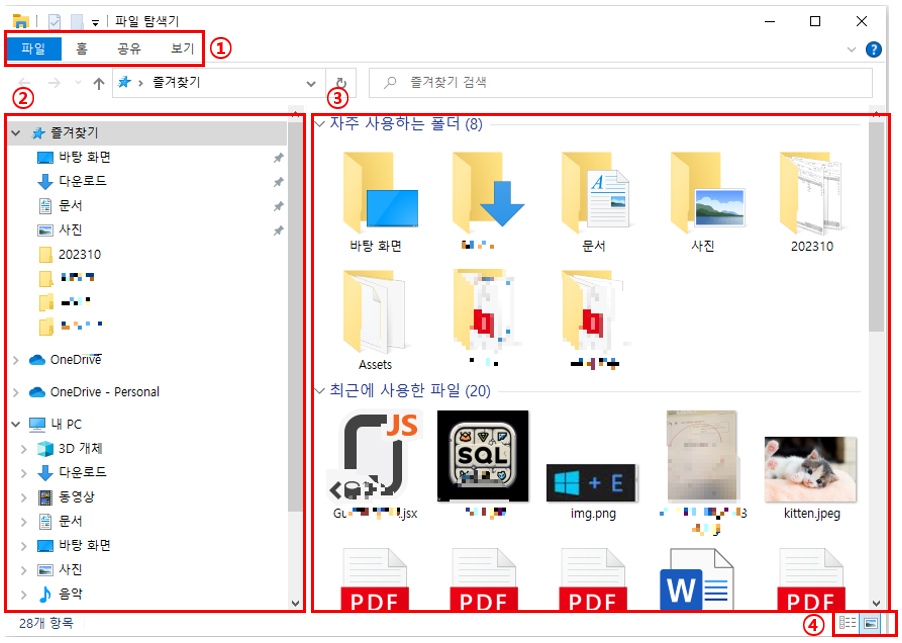 파일 탐색기 화면에 기본 구성에 대하여 설명 하겠습니다.