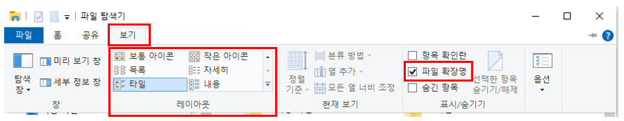 리본 메뉴 오른쪽에 파일 확장명이라는 체크 박스가 보이는데요. 기본으로는 선택이 안되어 있을건데요.
